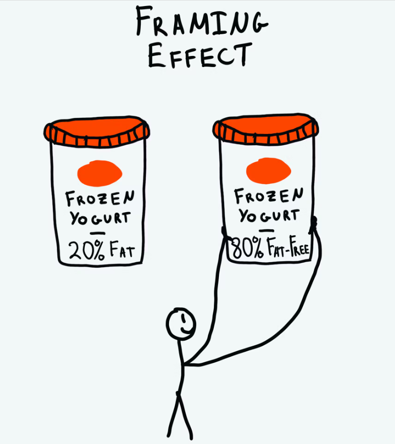 Framing Effect,框架效应的意义是,面对同一个的问题,在使用不同的描述后,人们会选择乍听之下较有利或顺耳的描述作为方案。